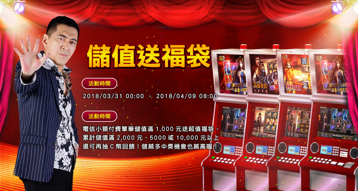 「錢街 Online」自 2018 / 03 / 31 (六) 00:00 起~ 2018 / 04 / 09 (一) 08:00 止,凡使用官方進行手機電信小額付款(台灣大、遠傳、中華電信、亞太、台灣之星)儲值指定面額,即可獲得超值福袋唷!另外活動結束後儲值累計10,000元以上可再抽C幣回饋!儲越多拿越多~中獎機會也越高喔!